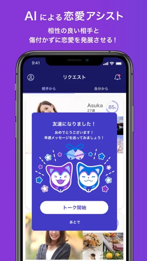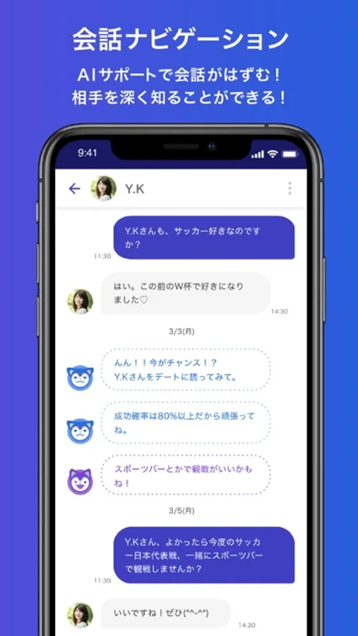 あなたと相手のトークをAIがアシストします。デートに誘うタイミングや二人の心の距離を縮める会話をAIがアシストします。