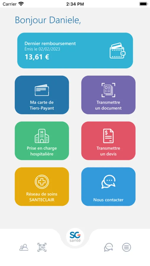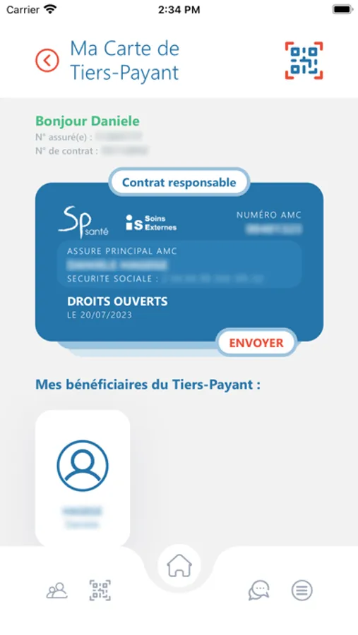 - Présentez votre carte de Tiers Payant aux professionnels de santé, avec ou sans connexion, au format carte bancaire, ou via un QR code ! Envoyez leur directement par email depuis l’application !