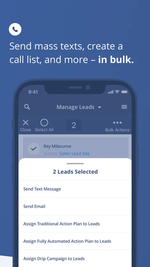 ** Save Time with Powerful Bulk Actions. – Send mass text messages, mass emails, bulk assign and unassign action plans and drip campaigns, and create a call list to more effectively call your leads.