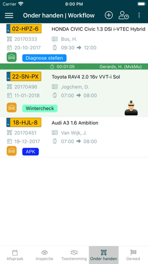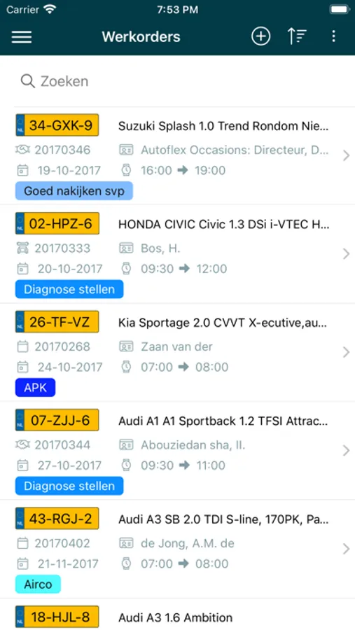 - Workflow: Beheer je workflow zoals je het gewend bent. Werkorders ingedeeld per status. Start met het klokken en controleer de voortgang van het voertuig.