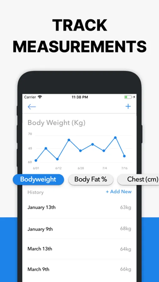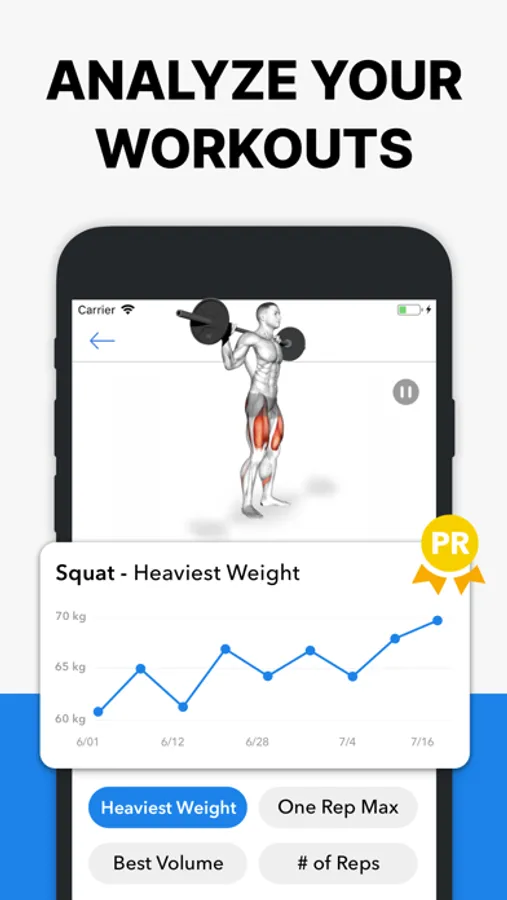 • Analyze the progression of your lifts with beautiful full-screen graphs of volume, best weight & total reps