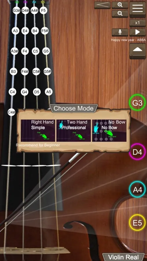 - Professional: Use 2 hands. Use right hand for dragging Violin bow (Arco) or touching Violin string (Pizzicato). Use left hand for choosing note (frequency) in Violin string.