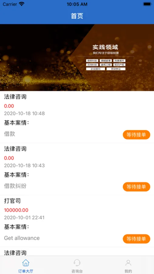 用户和律师进行连接的APP,分为用户端和律师端,两端进行连接,律师解答用户疑问,可分为免费咨询和有偿咨询,并且提供必要的周边服务
