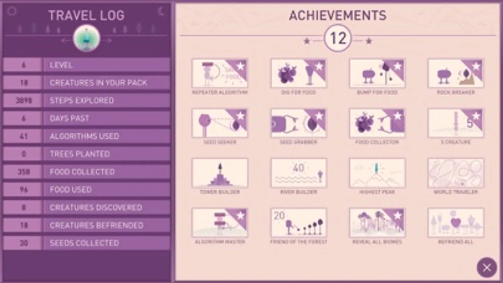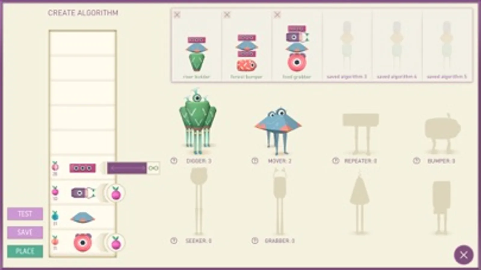 Throughout the game, you must find food sources to attract your own Pack made of local Algos creatures with special skills that will help you in your new environment. These creatures have functions like digging, moving, holding, grabbing and bumping, skills that will help you collect seeds and bring water to dry areas. When your Pack has more than one type of creature, you can combine them in a sequence (also known as an algorithm) to perform complex tasks and overcome challenges. Learning and mastering how to use these algorithms is the key to finding all of the seeds and restoring harmony to Algos!