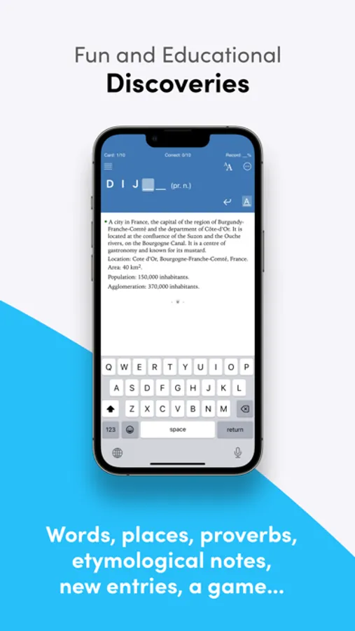 In Discovery Mode, ask for rare words, famous people or Heritage sites, and Antidote will display them in a random sequence. Create word lists that you can review and share with friends or students. Test your lexical knowledge with the game mode: guess the name of a country, city, person and more based on their definitions, and post your results on social media.