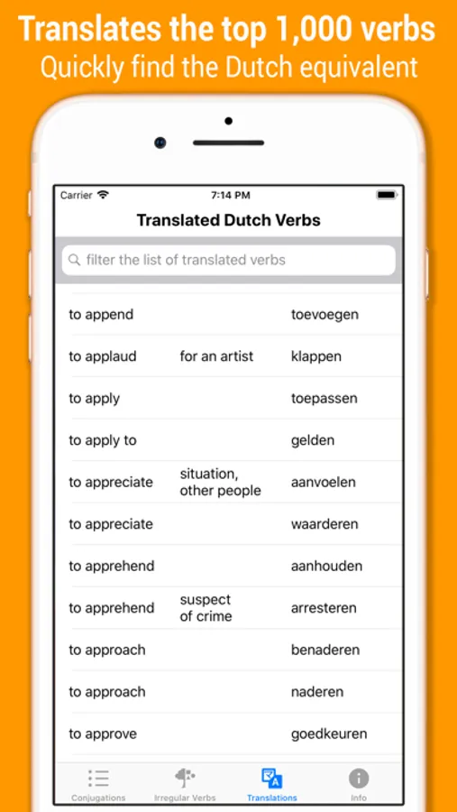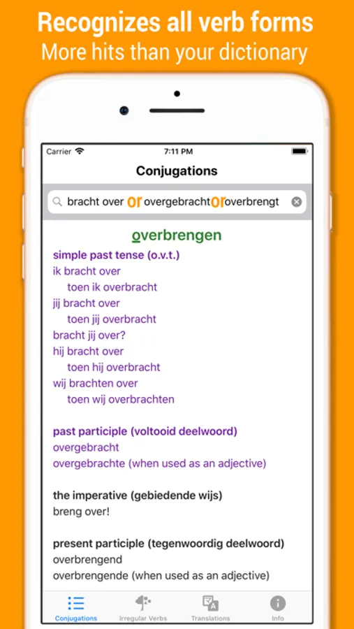 • Full conjugation of over 12,000 Dutch verbs. Plus thousands more when combined with a prefix you enter. New verbs will be added as they appear in the common Dutch language.