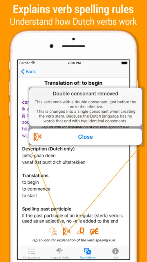 • The syllable in the verb with the emphasis and the applicable main spelling rules are shown. This helps you to understand and remember how the conjugation of Dutch verbs works.