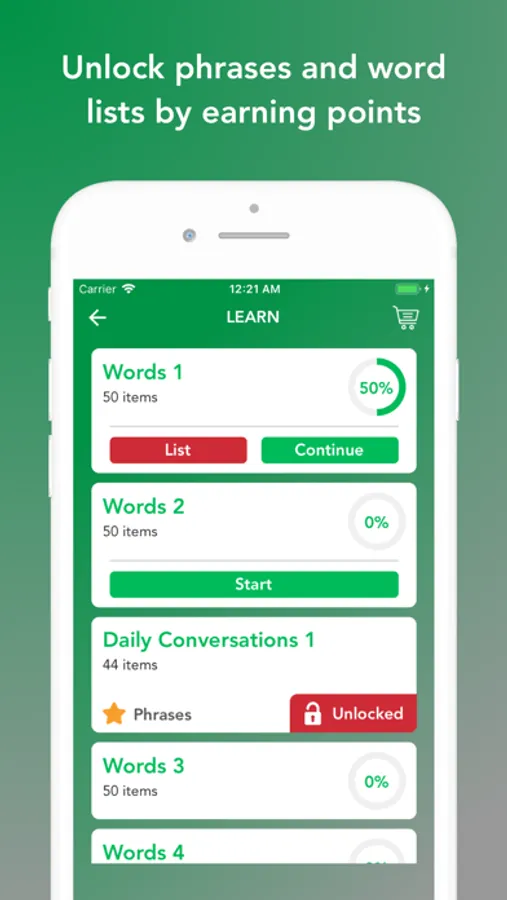 - Earn points by learning and practicing. Then unlock phrases and word lists.