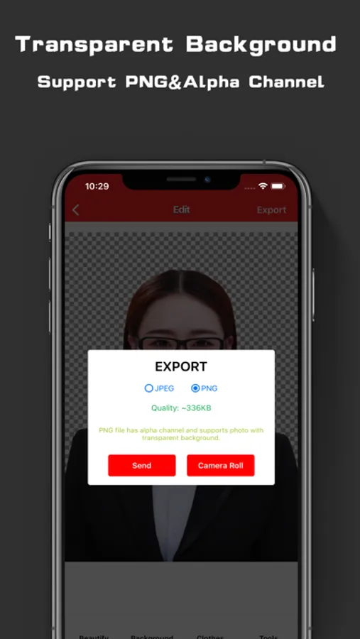 * The PNG file format contains an alpha channel for saving transparent background photos. The user can first separate the portrait from the background and set the background to be transparent and export in PNG format.