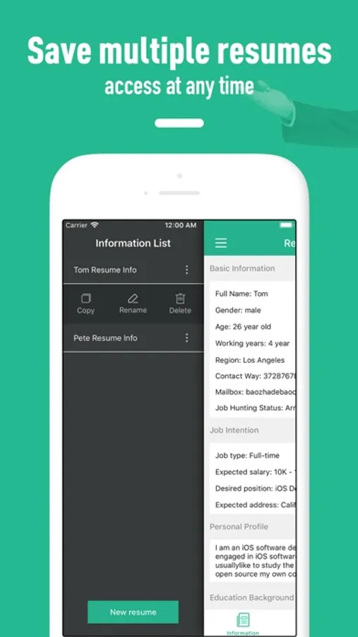Resume Builder is a professional, efficient and intelligent resume tool. In just a few minutes, you can create an eye-catching resume that will make your resume stand out and give the interviewer an unforgettable impression, making your job search smoother.