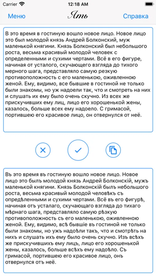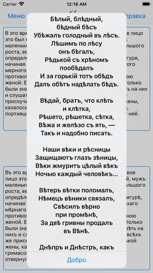 В настоящее время реализовано значительное соответствие дореволюционному языку, однако все еще неполное. Если Вы заметите ошибки перевода, то, пожалуйста, присылайте неверно переведенные слова через пункт "Сообщить об ошибке" меню приложения или же письмом на адрес электронной почты.