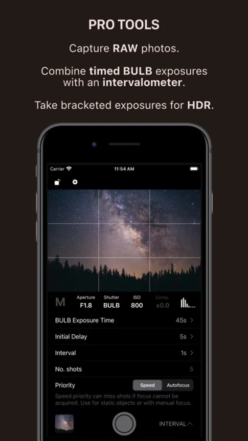 By combining ("stacking") multiple photos with the same composition, you can drastically reduce camera noise in post-production. Use Shutter to catch multiple exposures of the night sky. This will allow you to produce stunningly clear images of the Milky Way and Northern Lights (aurora borealis).