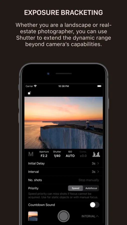 Shutter's timer allows you to specify an initial delay and intervals between photos. You can control waiting sound during the countdown, and photo capture sound when the self-timer triggers.