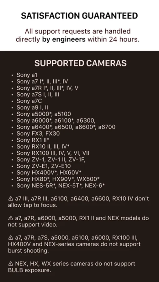 Easily capture photos with Sony Alpha and Cyber-shot cameras (supported models at the end of this description.) Shutter comes with a full-featured Apple Watch app.
