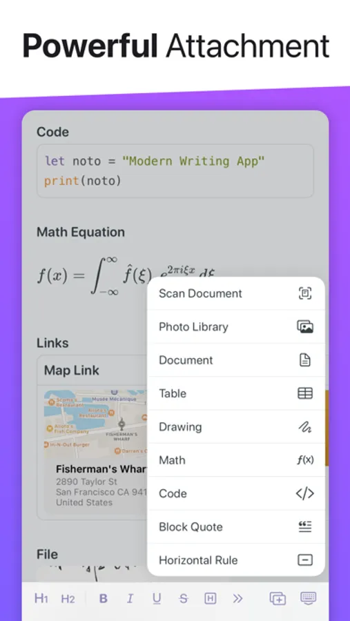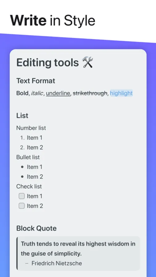 - Bold / Italic / Underline / Strikethrough / Highlight