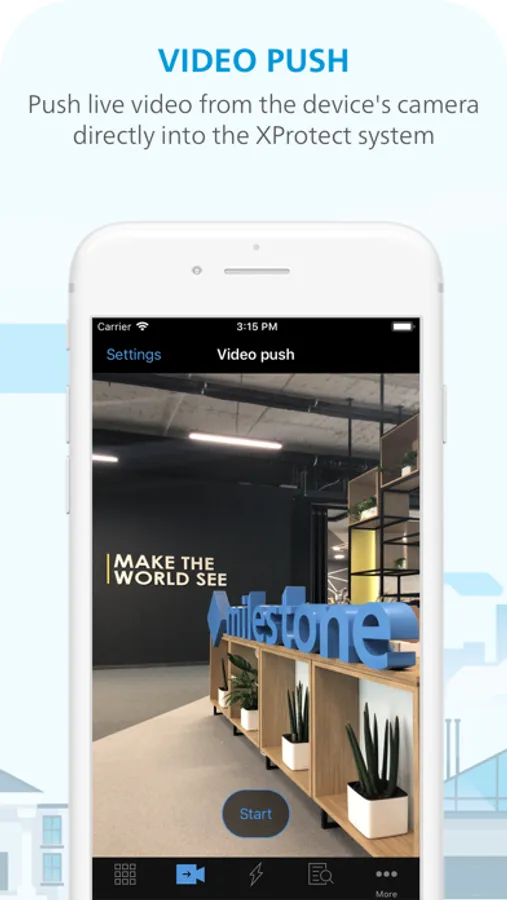 • Document any event while it happens by streaming video and audio from your mobile device’s camera directly into the Milestone solution