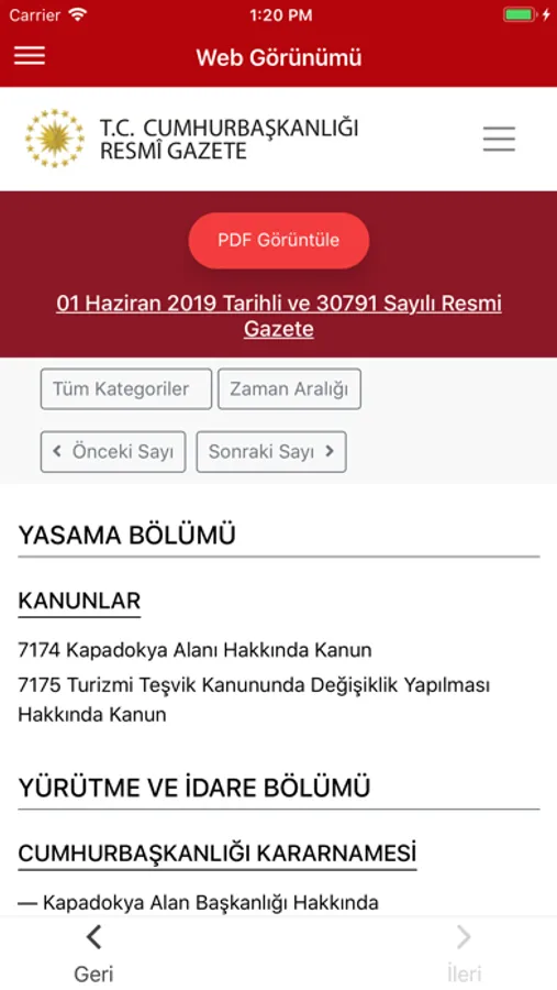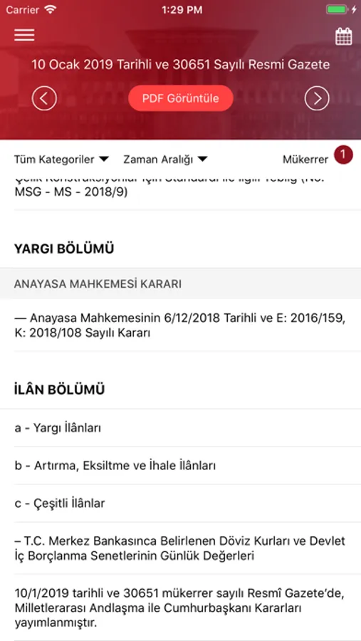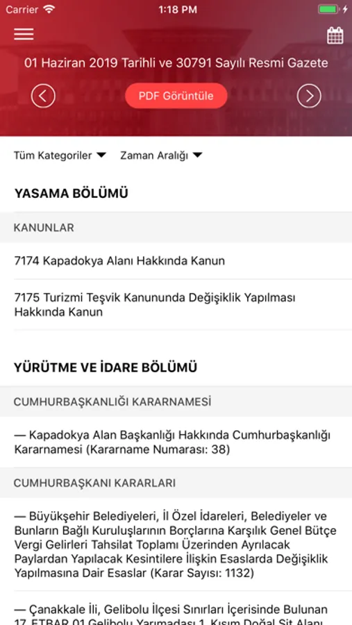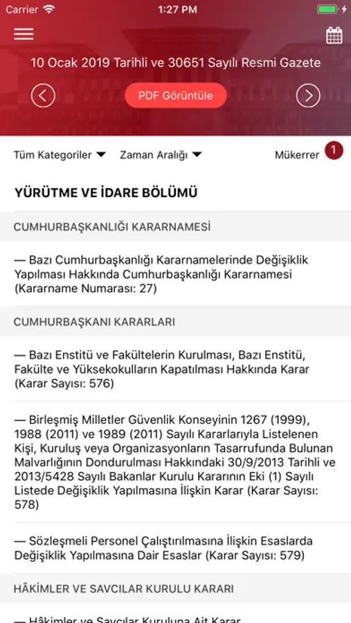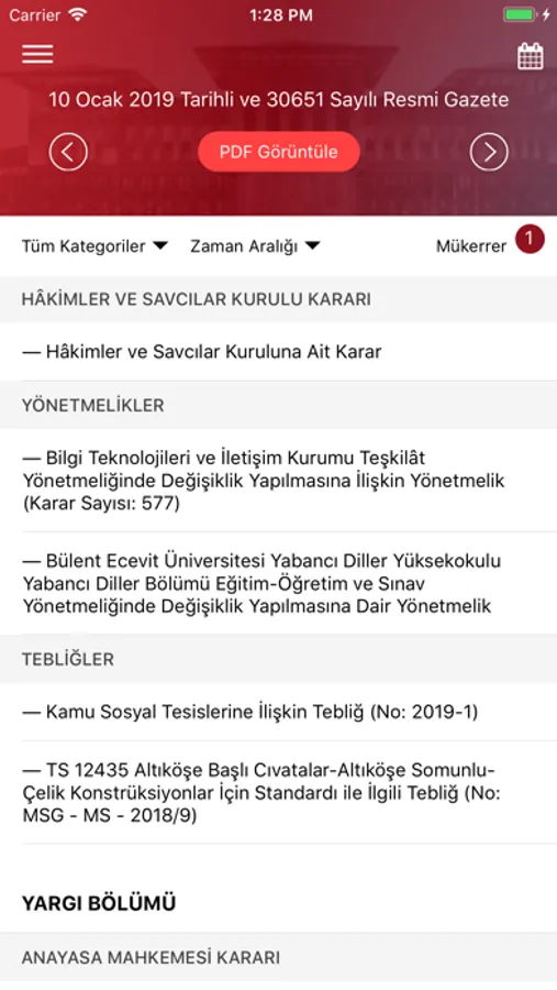 Ayrıca, Resmî Gazete uygulamasında “PDF Görüntüle” butonunda, içinde bulunulan gün yayımlanan Resmî Gazete’nin basılabilir PDF formatındaki nüshasına erişilebilmektedir. Takvim bölümünden ise görüntülemek istenilen günün üzerine tıklamak suretiyle, o Resmî Gazete içeriğine ulaşılabilmektedir.
