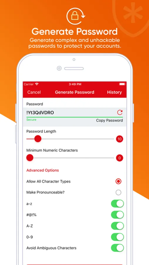 Facing difficulty in coming up with strong passwords by yourself? Go to app Settings and Generate Password. You will be able to find a variety of password suggestions that can be used later as Master Password or other website’s credentials. Or you can use it for any website’s credentials.