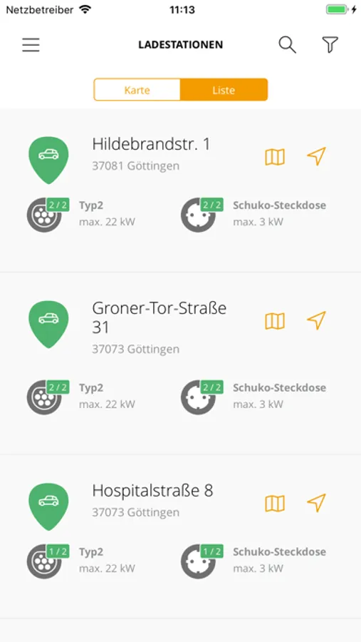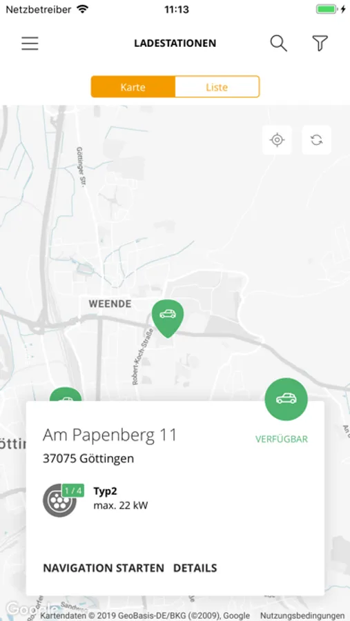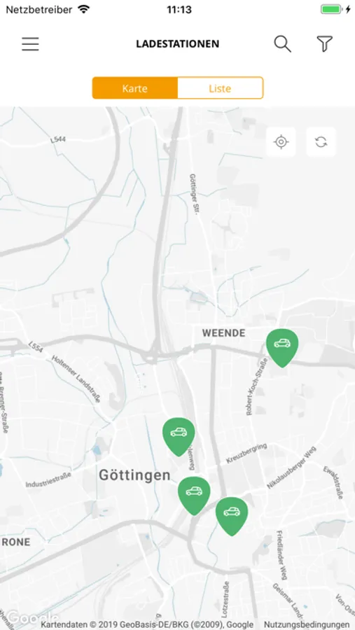 Mit Hilfe der Übersichtskarte finden Sie schnell eine passende Ladestation in Ihrer Nähe. Die Übersichtskarte zeigt Ihnen alle für Sie zugänglichen Ladepunkte an, die Sie ganz einfach mit der App freischalten können. Sie sehen auch deren aktuelle Verfügbarkeit und erhalten Informationen zu möglichen Störungen.