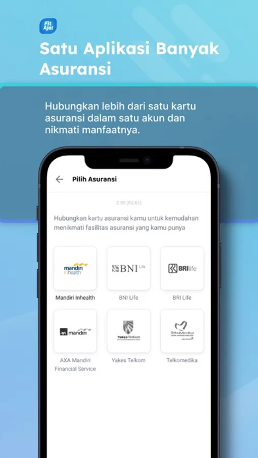Hubungkan salah satu atau semua kartu asuransi yang kamu punya ke aplikasi FitAja untuk akses berbagai layanan kesehatan dengan mudah, dari mulai pendaftaran fasilitas kesehatan online, konsultasi online, layanan telemedicine, beli obat, hingga klaim asuransi bisa kamu akses di sini.