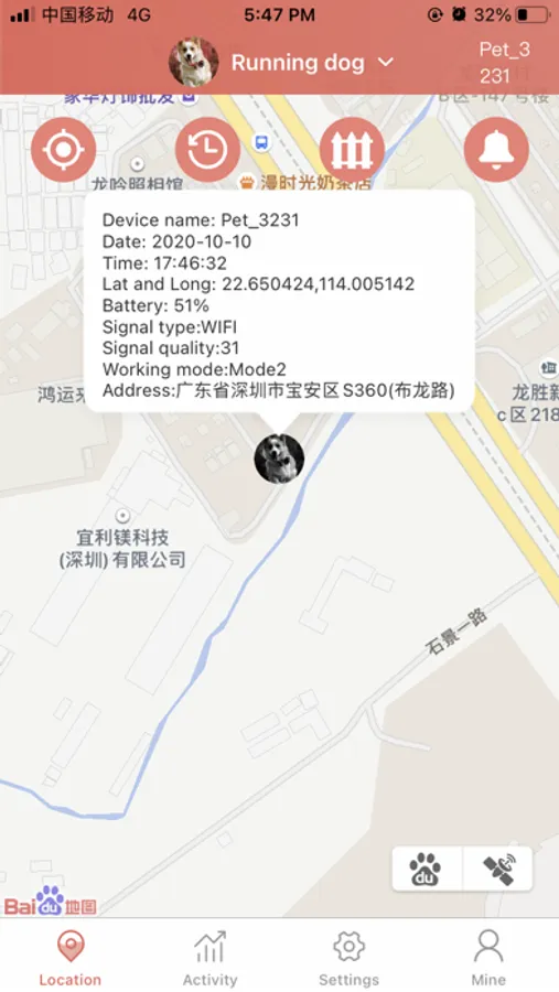 With PetWhere app, your device is always in control. You could easily use PetWhere account to login and check the routing history. And set the suitable performance like data upload time interval, Geo Fences.