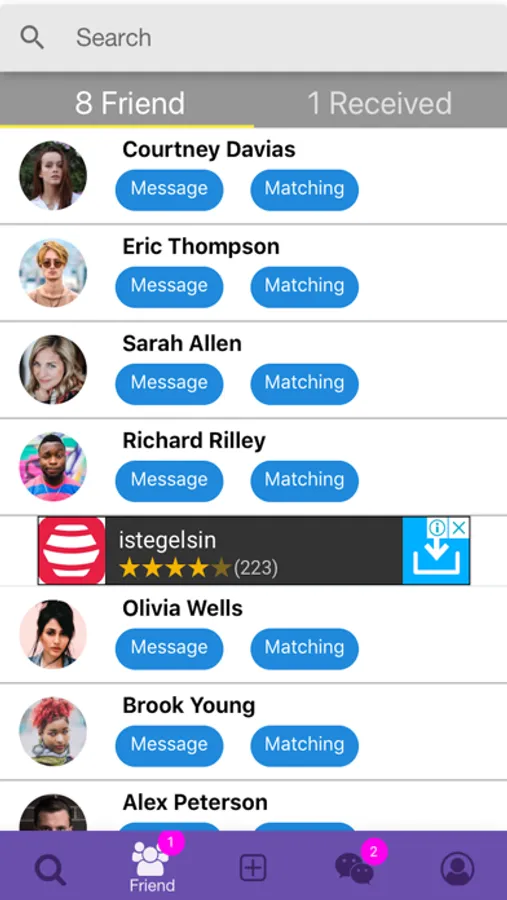 In search filter screen, you can select criteria like age, gender, distance, activity, place.
