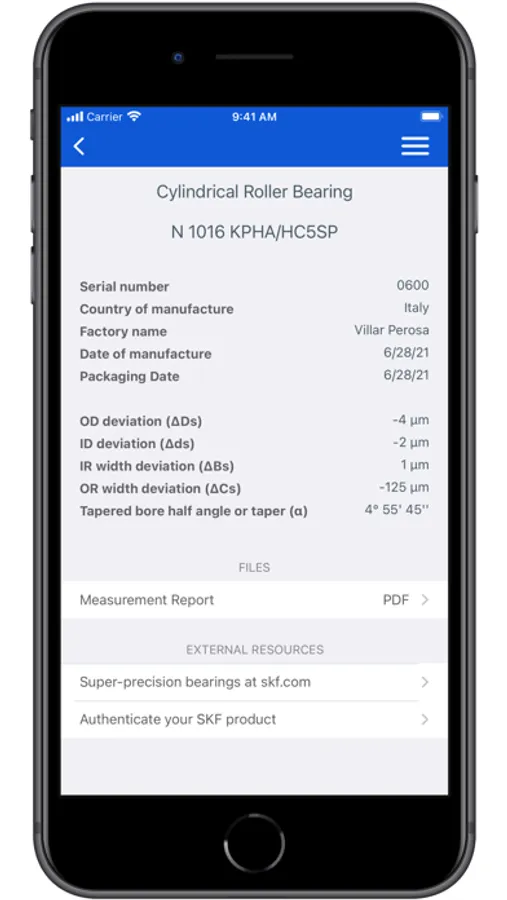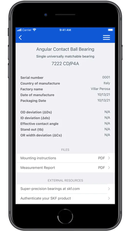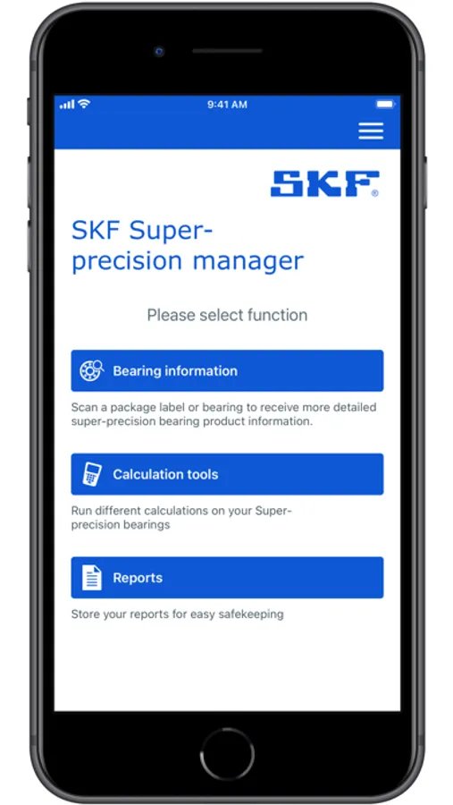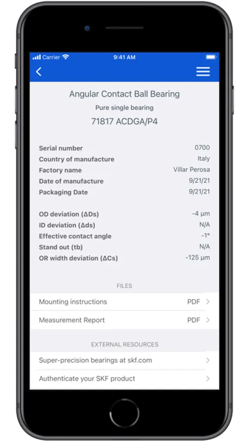 The SKF Super-precision bearing Data Manager allows you to scan data matrix codes on product packaging. This gives you immediate access to manufacturing and product specification data, including installation and mounting instructions.