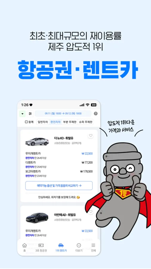 현재 95개 업체, 약 20,000여대 이상의 렌터카를 최저가로 실시간 가격비교 할 수 있는 재이용률 1위의 제주도렌트카 가격비교 플랫폼입니다.