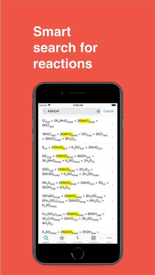 The "HandBook" section of the App includes the basic concepts of redox chemical reactions, classification and methods for compiling redox chemical reactions. The main schemes of redox reactions with such chemicals as permanganates, bichromates, sulfuric and nitric acids are also described. The reactivity series are also presented.