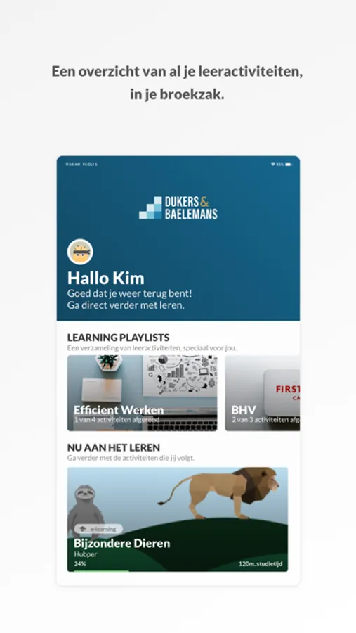 Met de Dukers & Baelemans app heb je altijd & overal toegang tot je online leeractiviteiten. Bekijk al je activiteiten, zoek in de bibliotheek, ga aan de slag met je e-learnings of train je kennis met Brainpower!