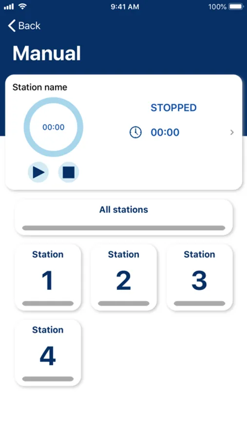 Access the manual section, select the station or all stations, select the duration of the irrigation program and then start the irrigation.