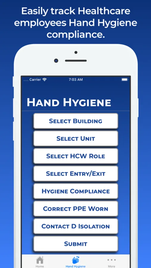 This tool is designed to track various HCW (Health Care Workers) Hand Hygiene Compliance. The application tracks which building and unit you are located in and allows you to include information like; correct PPE worn or contact D isolation required.