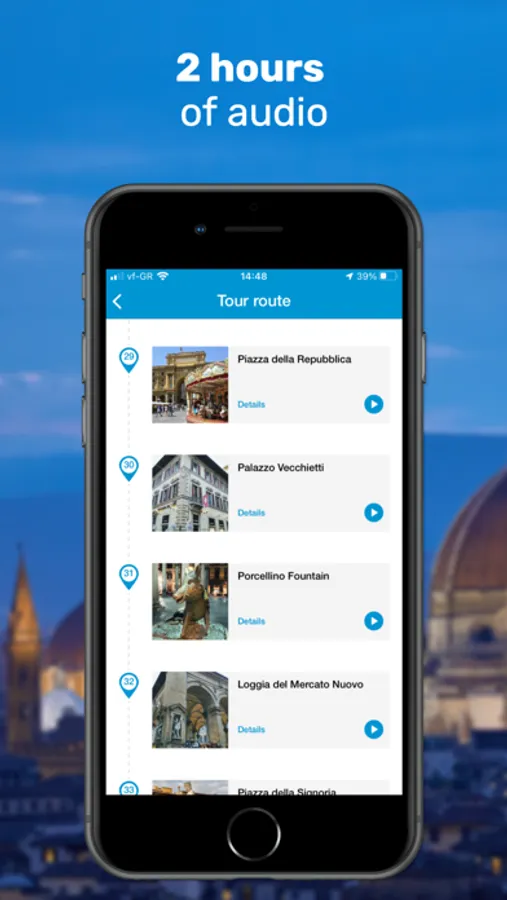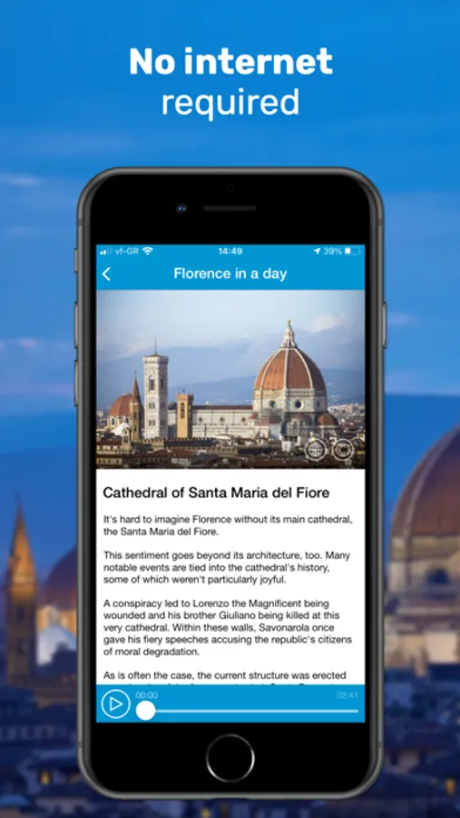Exploring the city has never been so easy, due to the in-built Florence offline map and easy to follow, pre-planned route. All landmarks on the map are numbered in order of convenience, while GPS navigation lets you track your location and find the optimal way to the nearest point of interest.