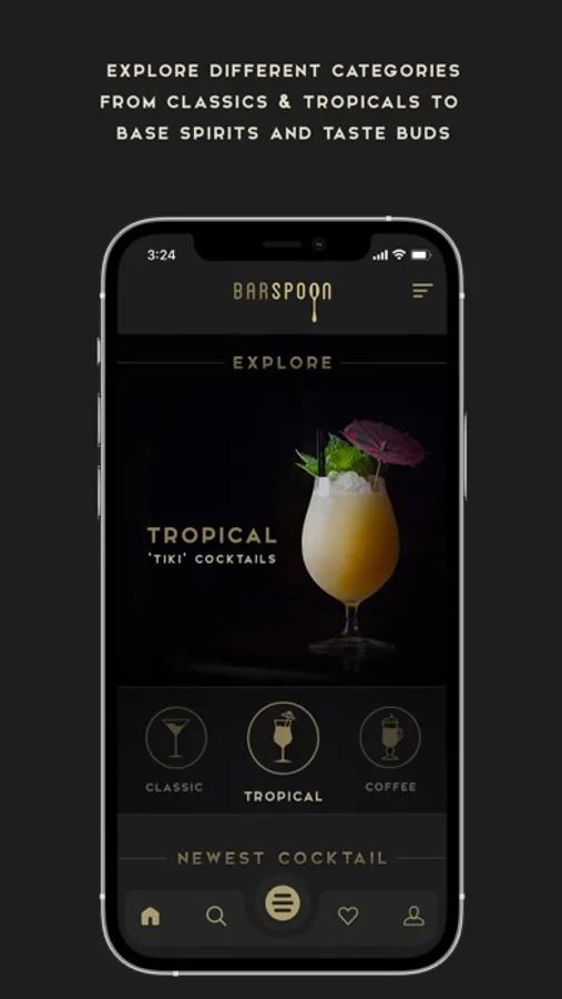 Explore the different categories from classics and tropicals (tiki) to coffee drinks and famous cocktails that have appeared in film. You can also search by the different eras, taste buds (sweet, bitter, sour, savory, smoky and spicy) and base spirits.