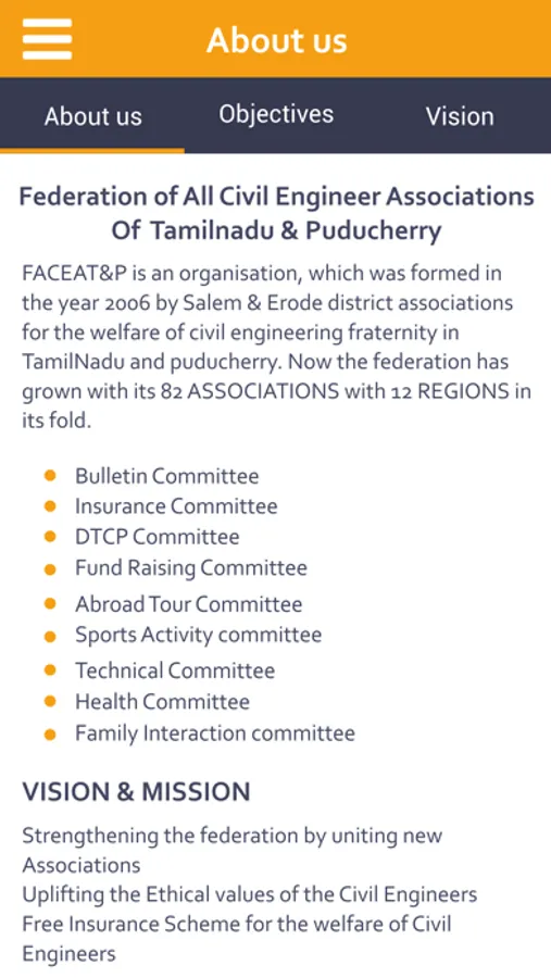 FACEAT&P is an organisation, which was formed in the year 2006 by Salem& Erode district associations for the welfare of civil engineering fraternity in TamilNadu and puducherry. Now the federation has grown with its 82 ASSOCIATIONS with 12 REGIONS in its fold.