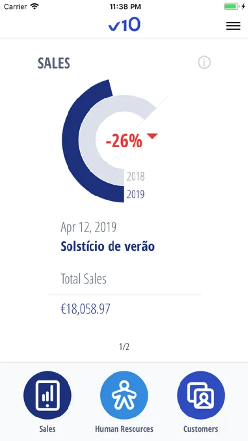 V10 Mobile is an app which allows you to access business information and ERP functionalities on mobile devices, enabling fast decision making and the performance of tasks that are relevant in a mobility context. The application currently includes four modules – Sales, Human Resources and Clients– to which new modules and functionalities shall be added from time to time. You can access real data from your ERP by subscribing this service.