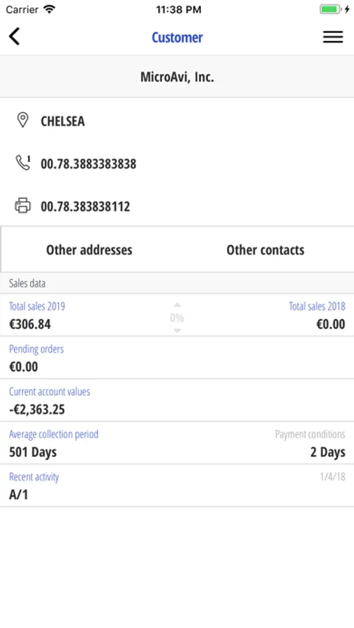 The Clients Module allows you to access your customers’ data in an easy, fast and secure manner. Through this module you will be able to check the Risk Analysis, Sales Data, Pending Orders, Current Accounts, Average Payment Time, as well as any other recent activity performed by your customers. Along with the Financial Information, this module also gives you the possibility to consult Customer Contact Data, such as Phone Number, Address, and Contact Persons which have been associated through the CRM.