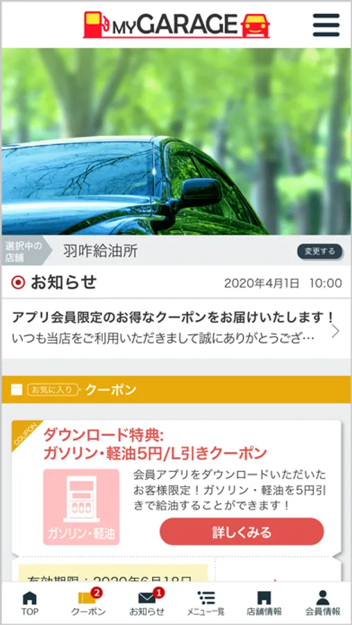 当社のアプリ「上田石油(株) My Garageアプリ」ではアプリで簡単に洗車・コーティングなどのご予約や愛車のメンテナンス管理が可能の他、ご登録いただいた店舗で利用いただけるお得なクーポンや各種メニューの割引情報を配信しております。