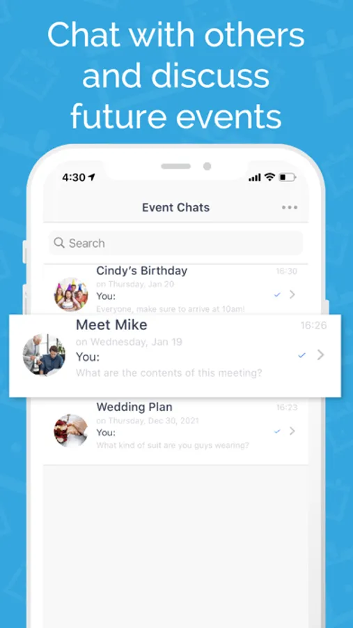 Chat and share pictures, videos, audio, links, and documents in event-dedicated group chat rooms!