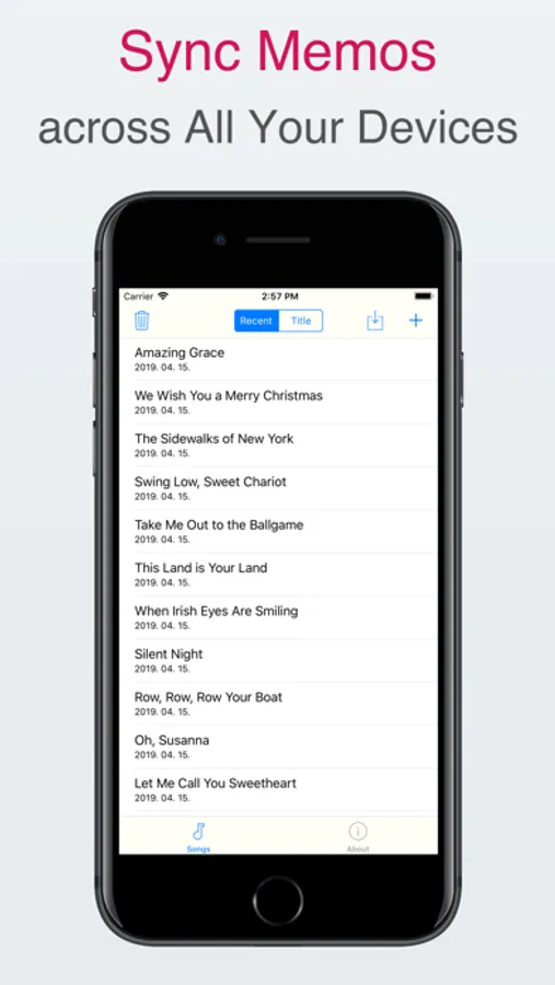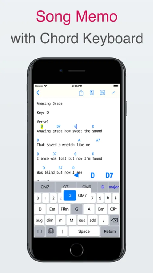 Song Memo is the easiest way to take notes of your song ideas. The chord keyboard of Song Memo allows you to write chord progressions more quickly. Chords are automatically detected while you are taking a note. You can change the key by transposing your song, or by using capo. Import memos from Cloud or other Apps. Share your memos in a variety ways.