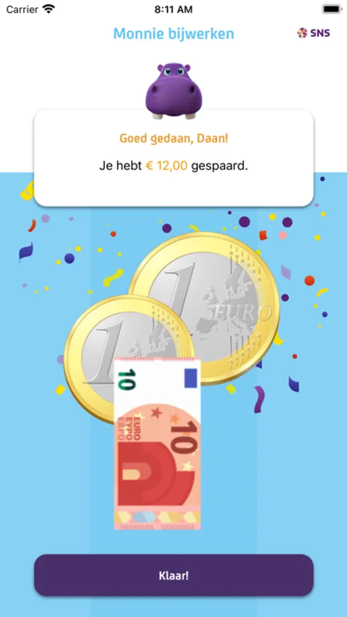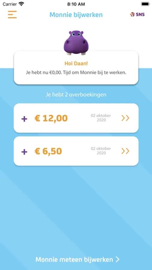 De SNS Monnie app is er voor iedereen die het nijlpaardje Monnie in huis heeft. Een vrolijk beestje met financieel talent dat hoort bij de betaalrekening SNS Jeugd Betalen. Deze app werkt dus alleen als je Monnie als huisgenoot hebt.