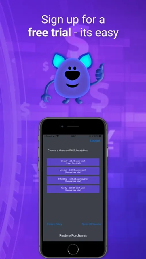 You can purchase a MonsterVPN subscription directly within the app. You have the option of purchasing a 1-week, 1 month, 3-month or 1 year subscription. Payments are charged to your iTunes account at the confirmation of purchase. Your subscription will automatically renew 24 hours before the end of each current monthly period unless auto-renew is turned off. Auto-renewal can be turned off at any time within the user's Apple ID Account Settings → Manage Subscriptions.