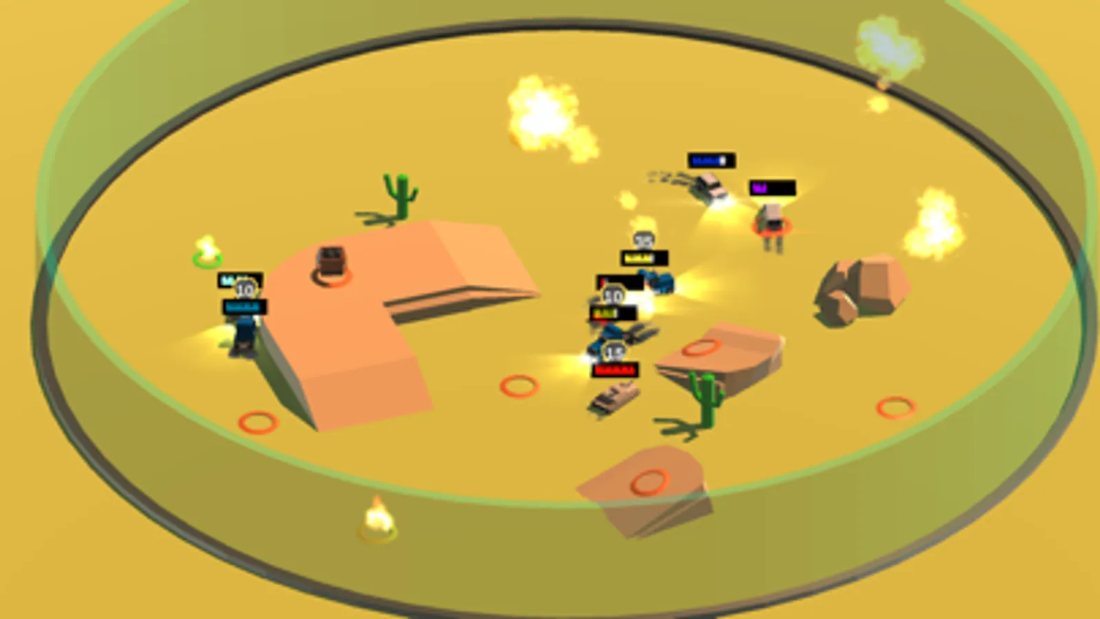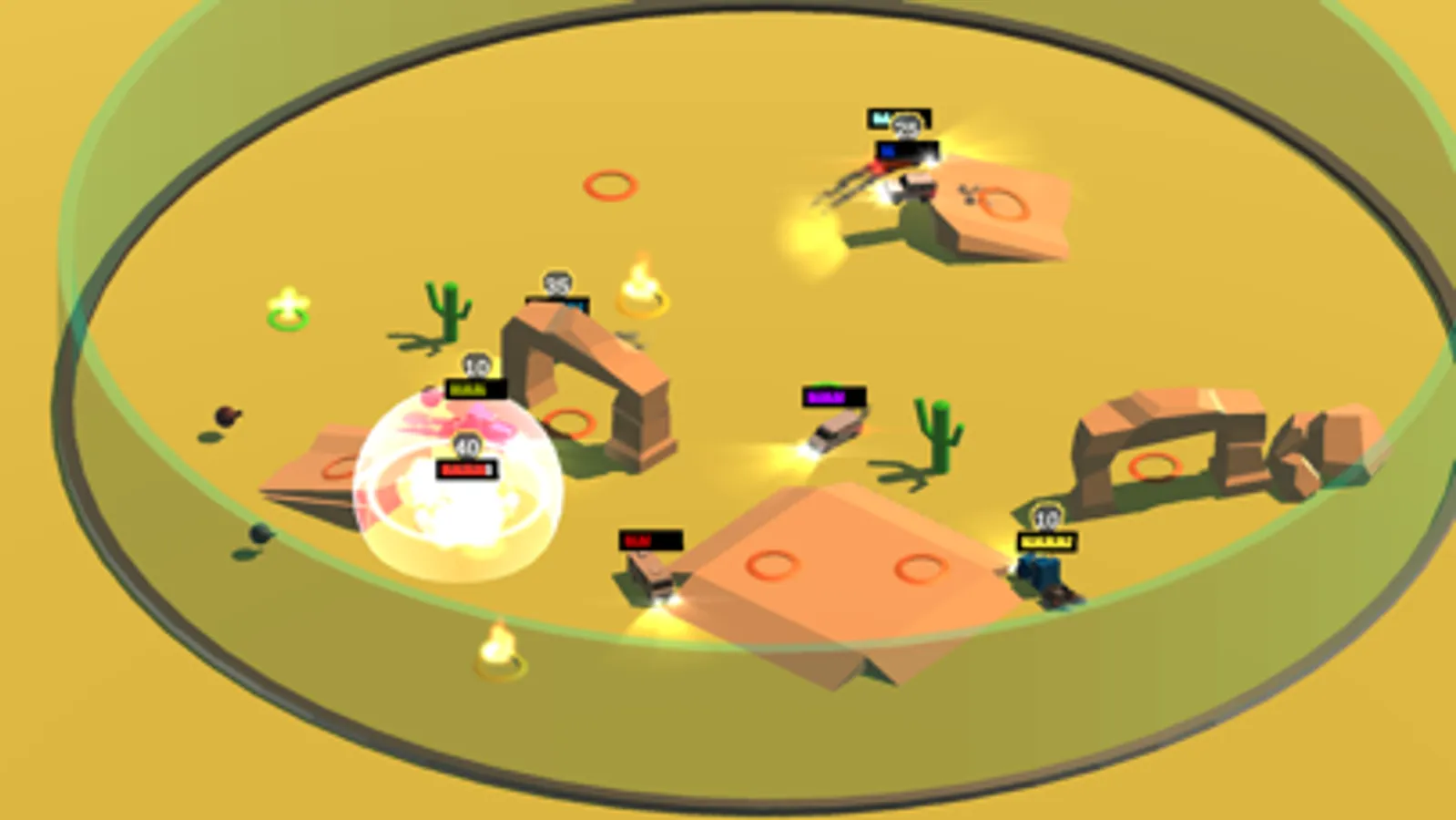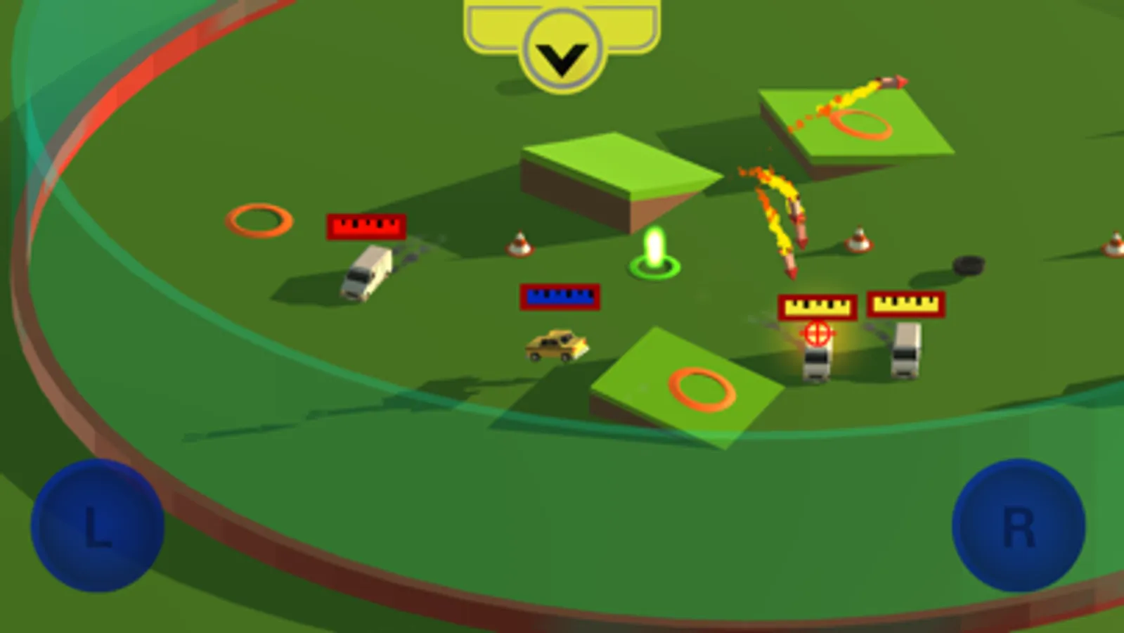 Demolition derby with powerful weapons: rockets, bombs, turbo boosts, energy balls, ...