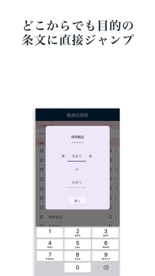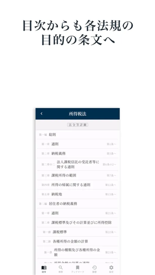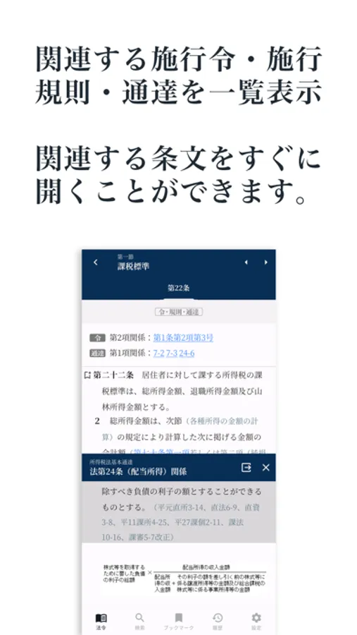 目的の条文が決まっている場合には、番号を指定してすぐに表示できます。また、施行令・施行規則・通達がある場合には、その条項に対する言及がある条項を一覧として提示し、すぐに下位の法規にアクセスできるようにしています。