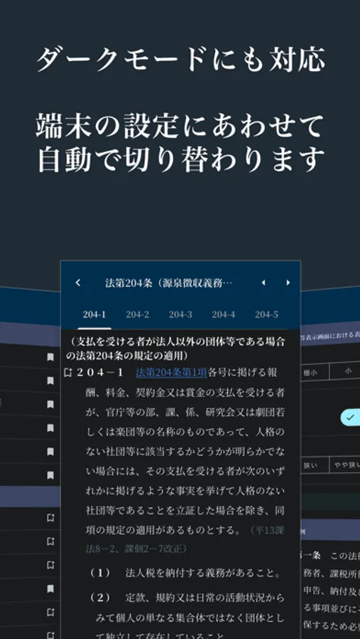条文を読むときの文字サイズや行間の広さを調整できるほか、明朝体とゴシック体を切り替えることができます。小さい文字が読みづらい場合は大きく広く、より多くの情報を詰め込みたい場合には小さく狭く、使いやすい状態にカスタマイズすることができます。