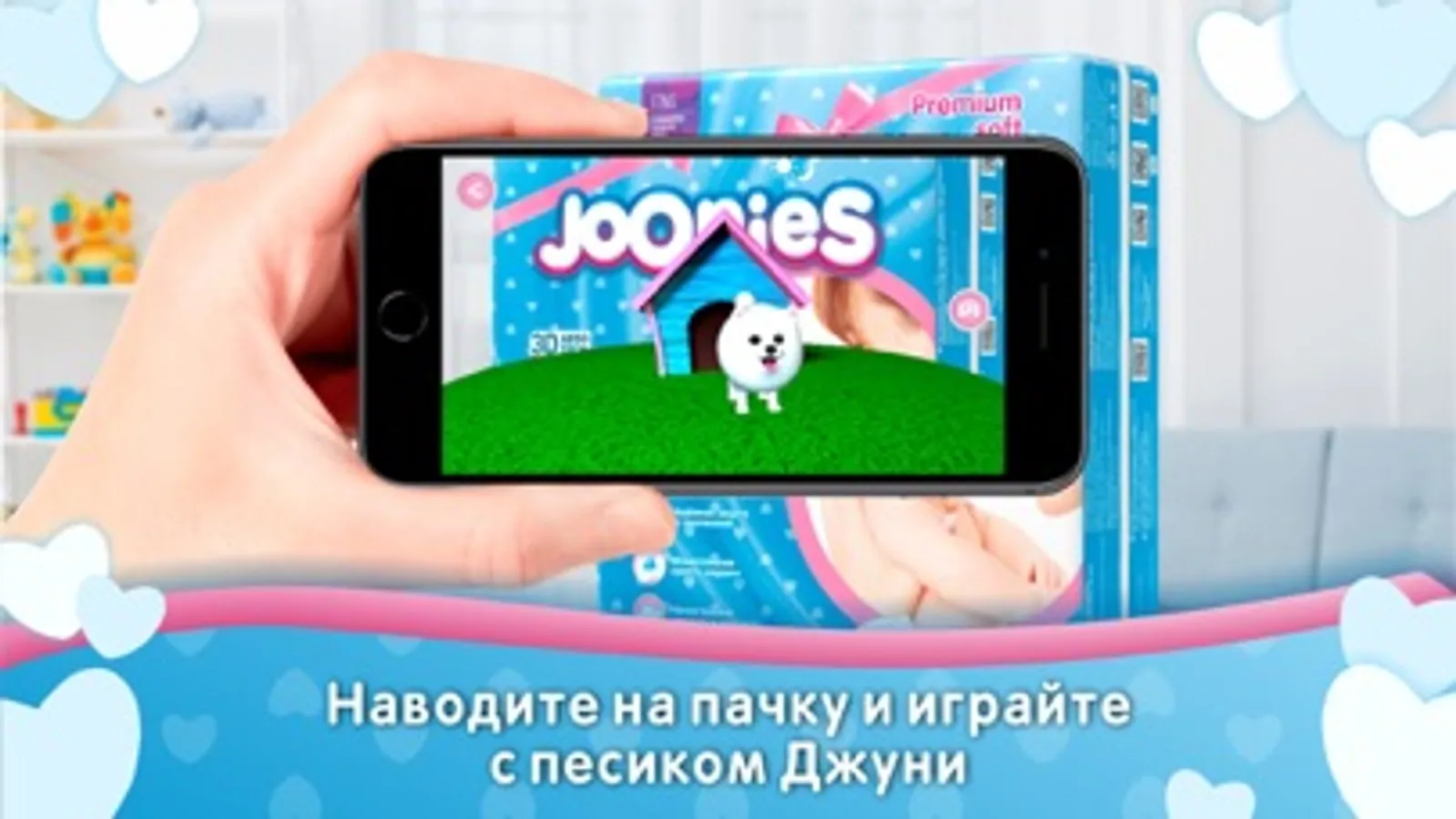 Скачайте приложение, нажмите кнопку «Начать» и наведите экран телефона на упаковку подгузников ТМ Joonies. Джуни поприветствует вас прыжками и веселым лаем.