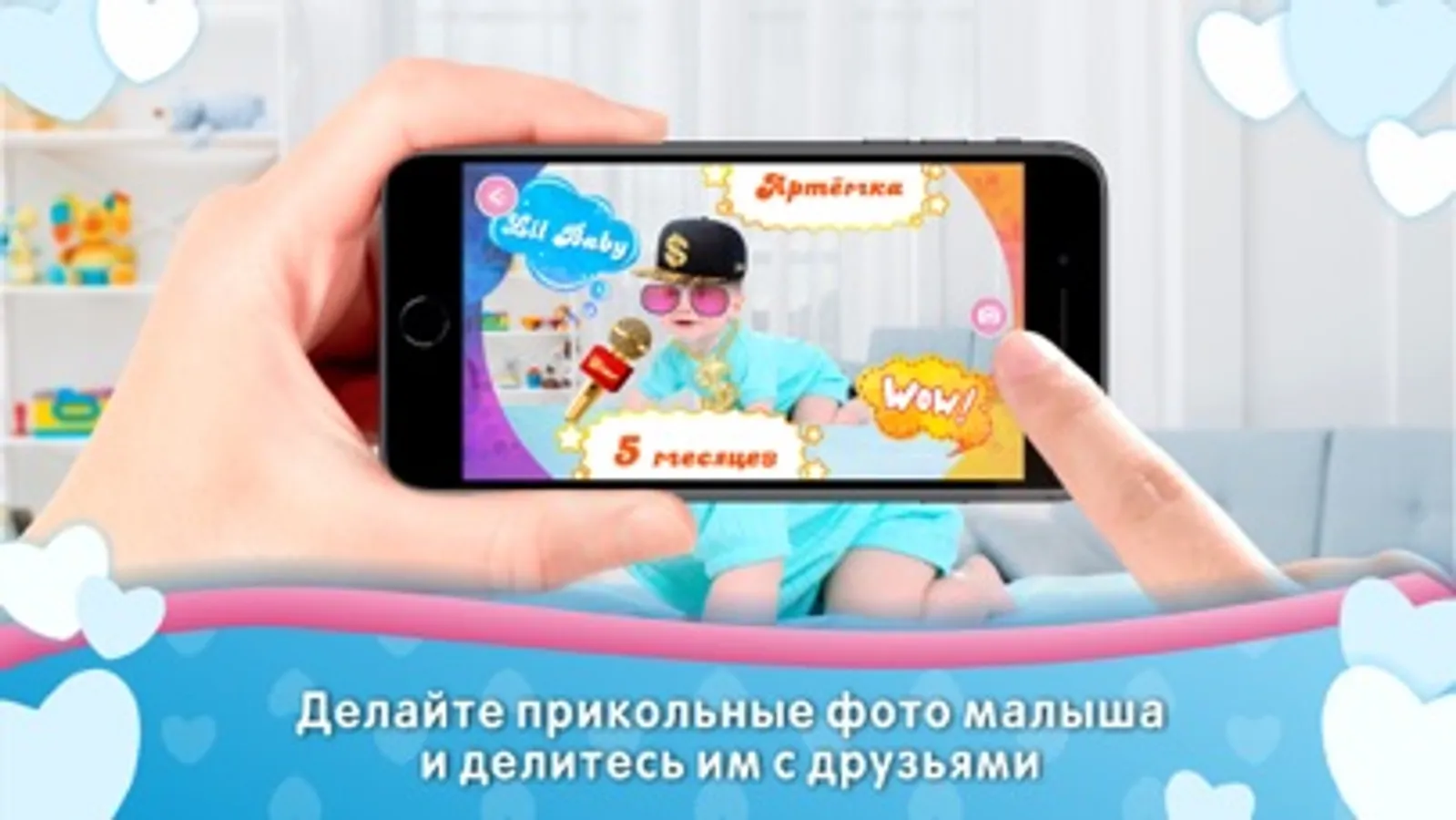 Каждый размер подгузника разблокирует новые фото рамки, где можно указать имя и возраст ребёнка, а так же украсить фото элементами в тему рамки.