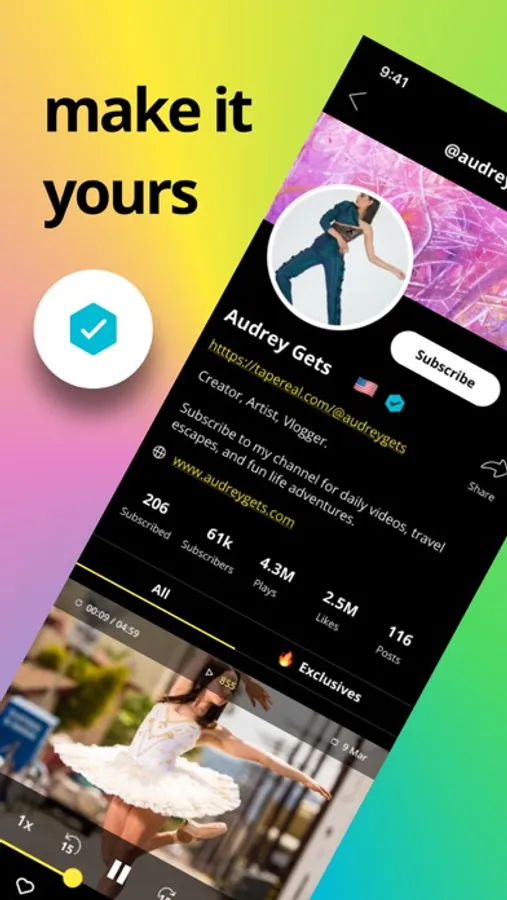 ● Upload your larger 4K videos, music, and clips with a personalized creator channel at: TapeReal.com/@yourname.