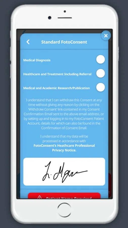 Patient consent is awarded in-app or online. Compliance and auditing is taken care of and our VAULT system is your legal safety net.