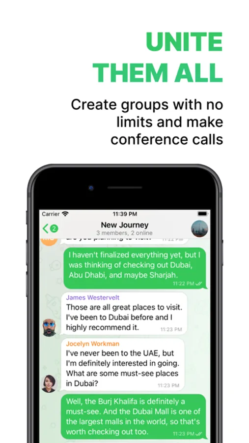 Create groups with up to 20 000 members - connect your family or even whole company at once.